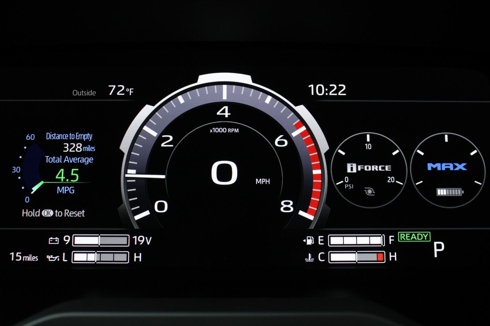 - Gauges -inc: Speedometer, Odometer, Voltmeter, Oil Pressure, Engine Coolant Temp, Tachometer, Traction Battery Level, Power/Regen, Trip Odometer and Trip Computer